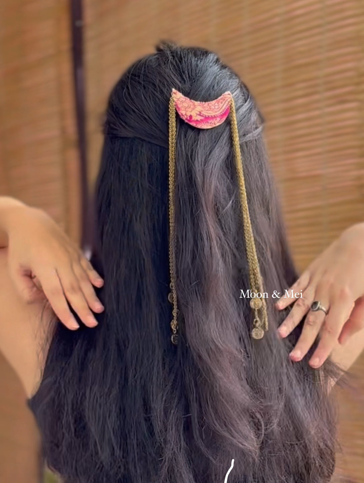 🌙 Boho Pink Crescent Hair Clip with Chains – Inspired by Kashi Brocade
