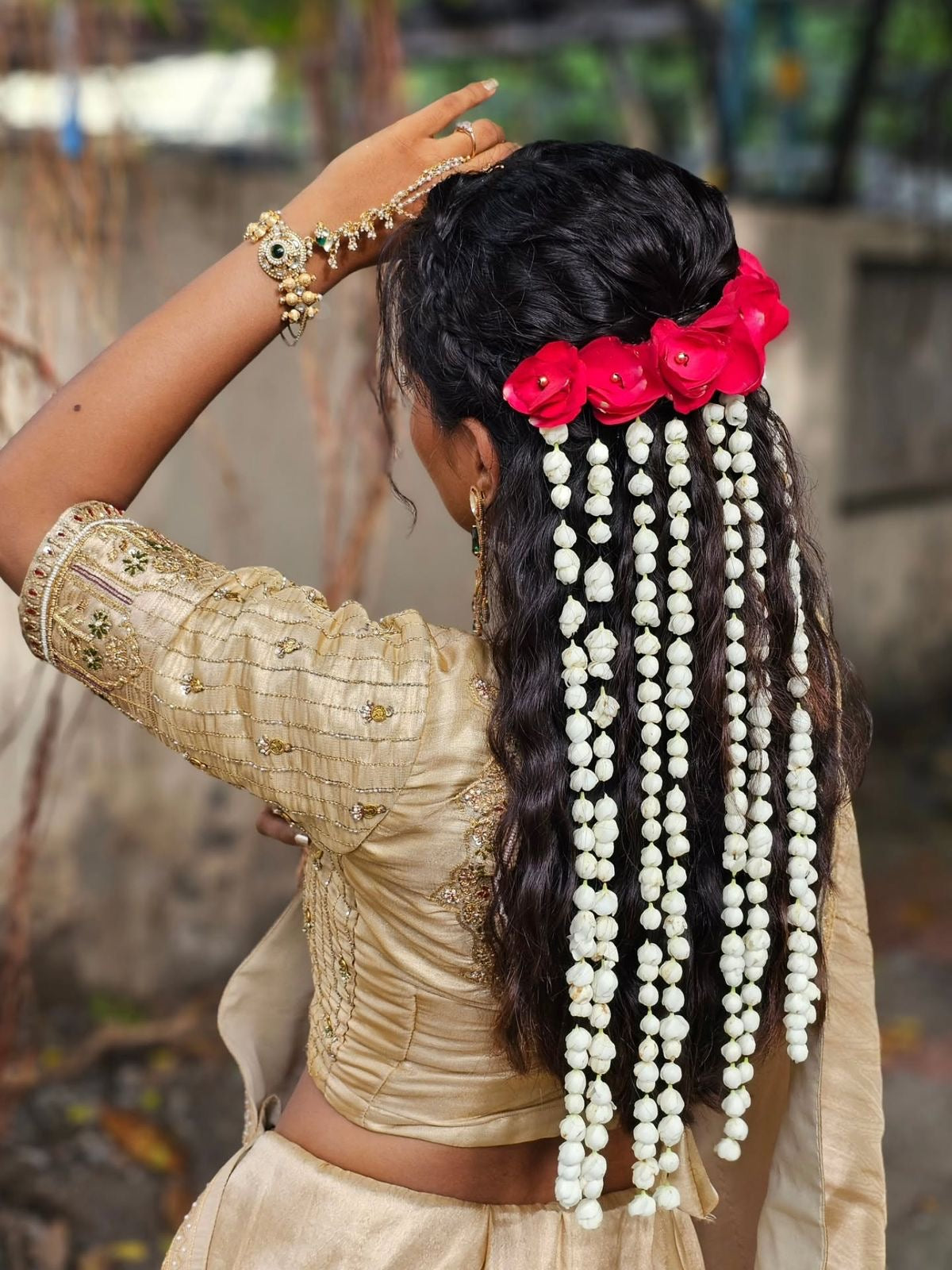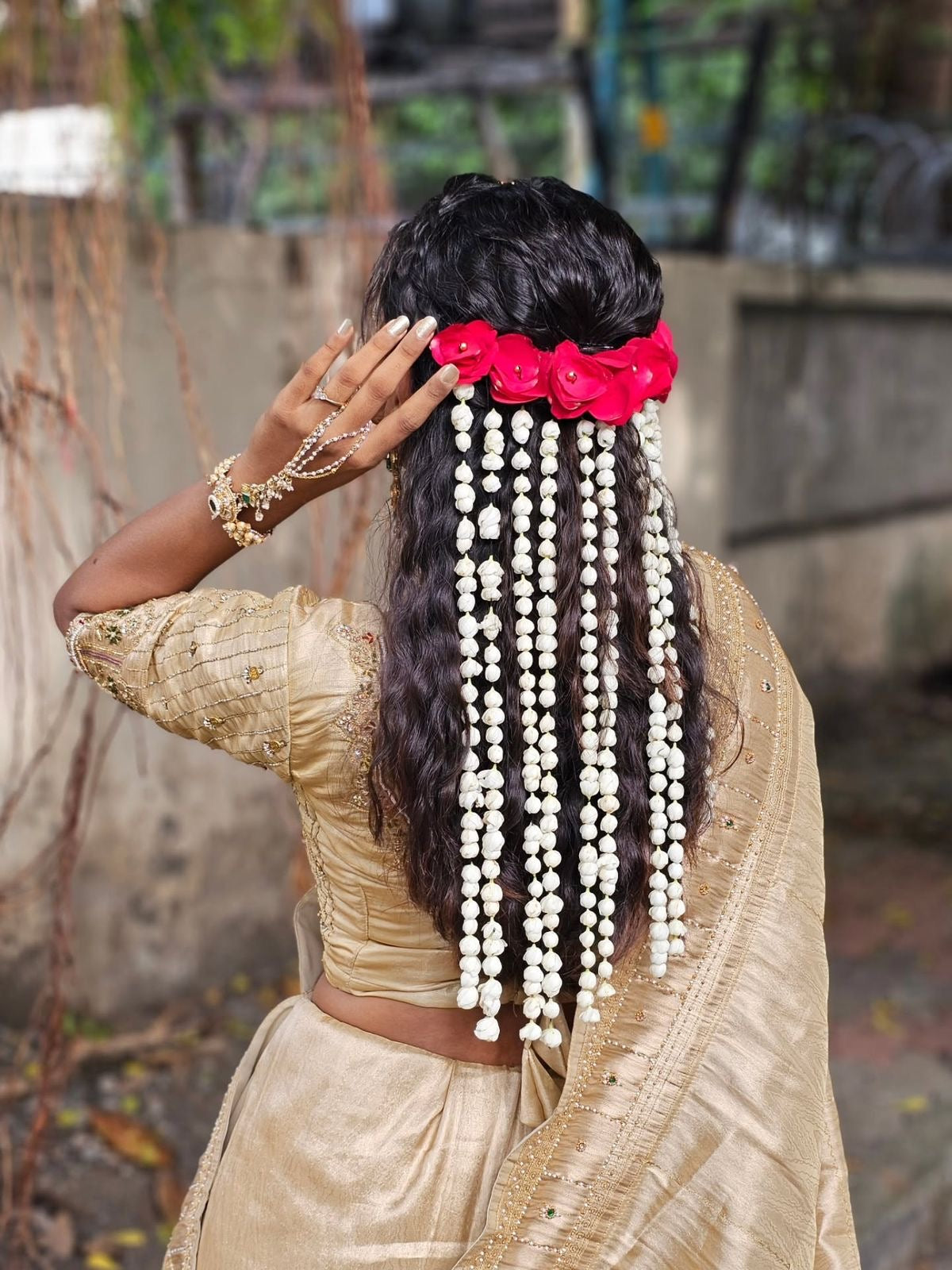 Step into your big day with elegance wrapped in every strand. Our handcrafted Bridal Mogra & Pearl Hair Strings are a tribute to timeless tradition—blooming mogra garlands layered with graceful pearl loops to create a majestic silhouette from the back.