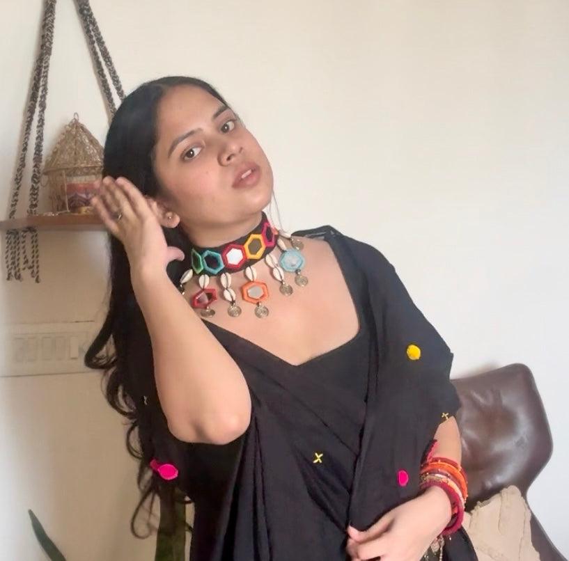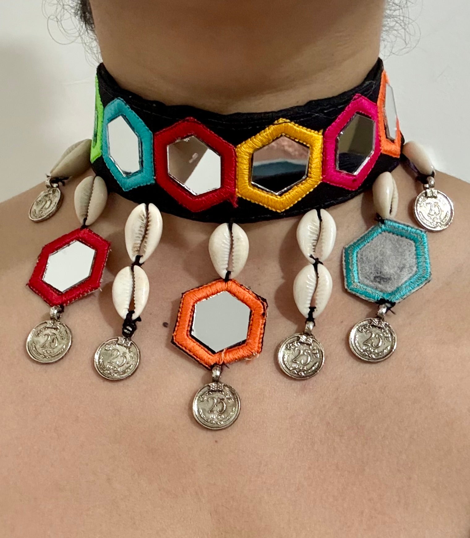 3. Mirror Work: Small mirrors are embedded within the choker, reflecting light and adding a sparkling effect. This mirror work is a hallmark of Banjara jewelry, contributing to its eye-catching appearance.