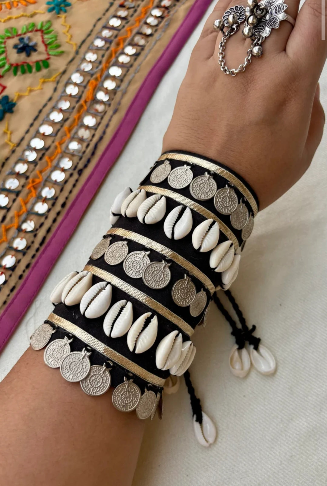 Make a bold statement with our Boho Tribal Mirror Work Handcuffs, beautifully handcrafted to add a touch of ethnic flair to any outfit. These fabric-based cuffs feature intricate mirror work, traditional metallic charms, vibrant thread embroidery, and cowrie shells – combining folk art with modern bohemian vibes.