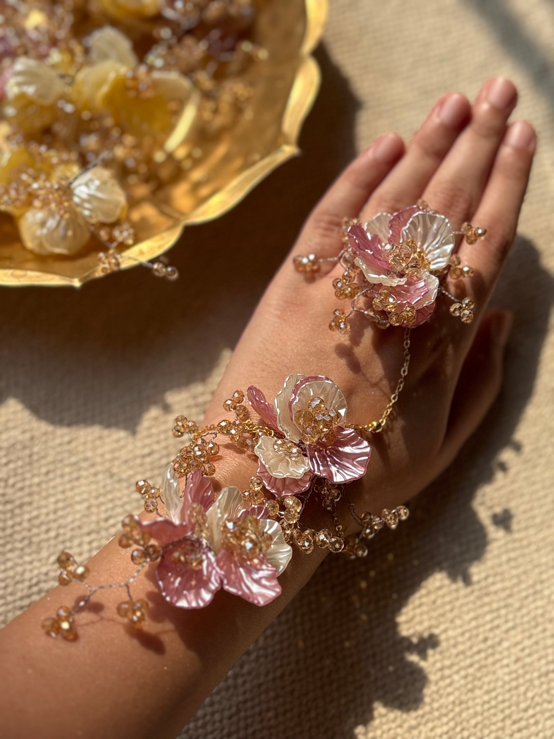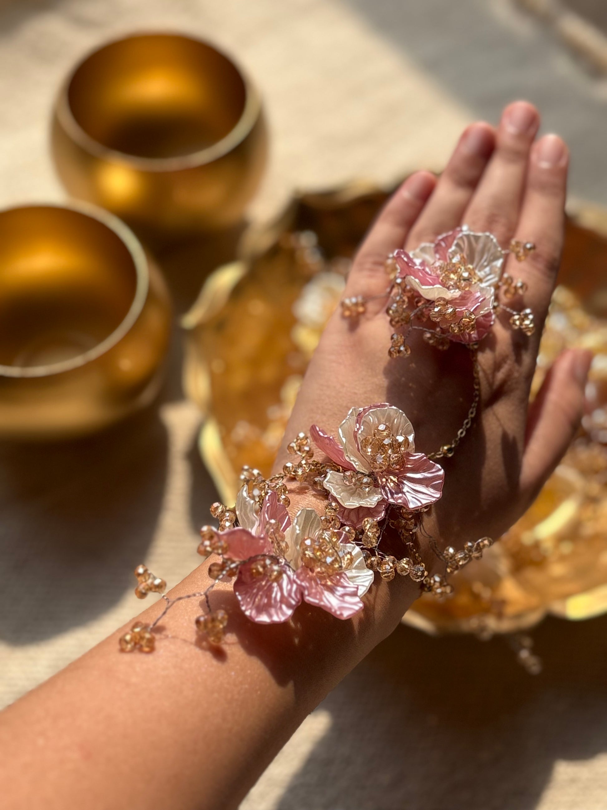 Crafted especially for the Mehendi and Haldi ceremonies, each piece is a celebration of the modern bride — luminous, free-spirited, and effortlessly graceful. Hand-sculpted in premium resin, adorned with gold-plated detailing, pearlescent tones, and delicate floral motifs, these jewels echo the joyful hues of haldi and the vibrant energy of mehendi.