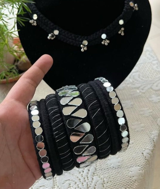 Elevate your ethnic look with our Noor Silver-Embellished Bangles Set a stunning blend of tradition and elegance. Handcrafted on rich black velvet, this set features intricate silver detailing including mirror accents, braided metallic threads, and ghungroo embellishments that create a rhythmic charm with every move. Perfect for weddings, festivals, and cultural events, these bangles add a bold, regal touch to any ensemble. Pair them with traditional or fusion wear for an effortlessly chic statement.