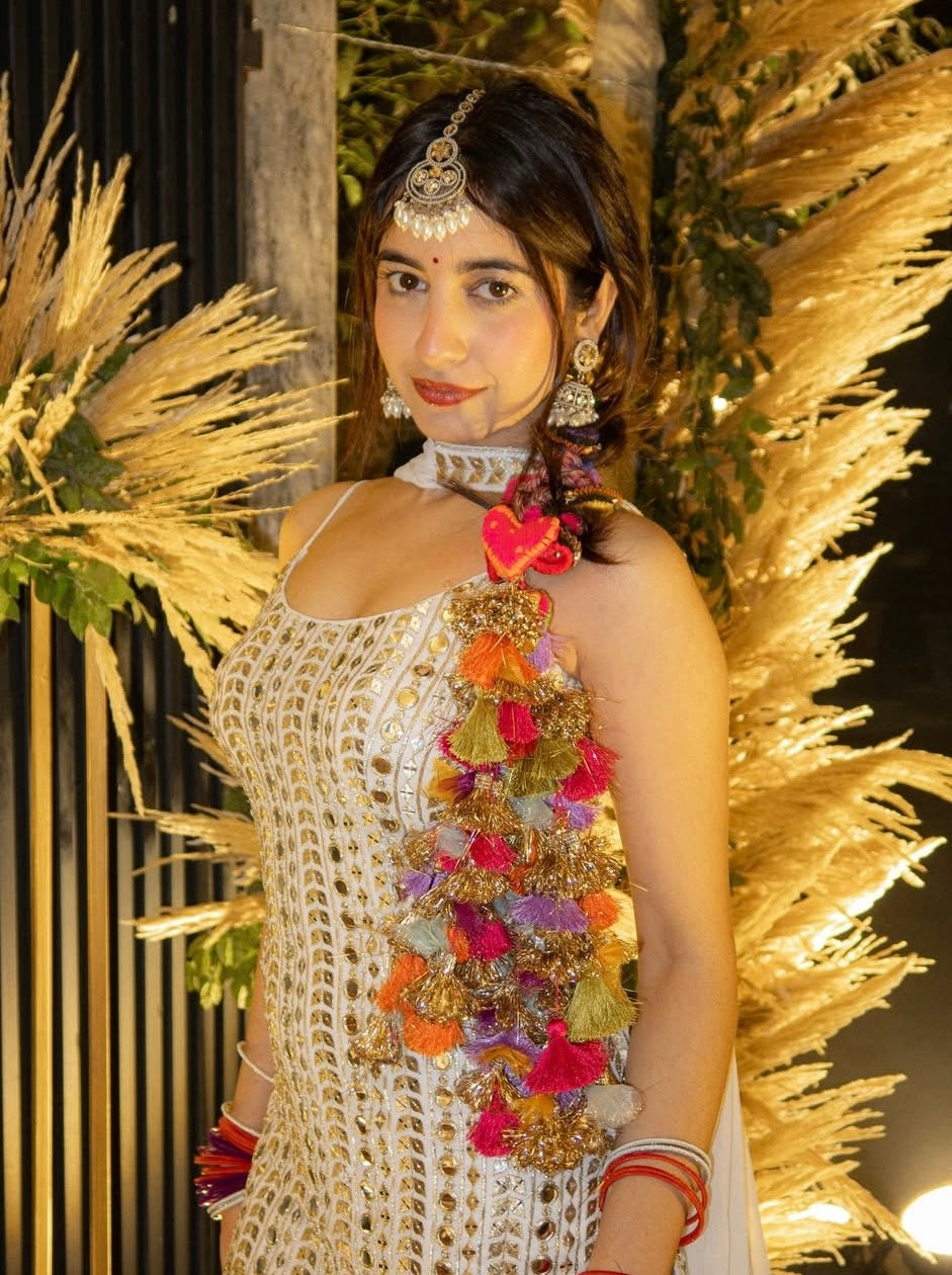 Each piece is meticulously handcrafted by skilled artisans using premium silk threads, luxe embellishments, and intricate detailing that elevate your look from beautiful to breathtaking. Whether it’s a mehendi, sangeet, haldi, or the big day itself, this Parandi is your perfect companion for a royal, show-stopping bridal look.