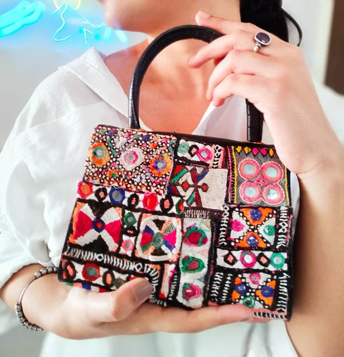 Introducing our exquisite Banjara patchwork bag, a vibrant blend of tradition and contemporary style. Handcrafted by skilled artisans, each bag tells a story through its intricate patchwork design, showcasing the rich heritage of the Banjara tribe. Made from premium materials, this spacious bag is perfect for carrying your essentials with flair. Elevate your accessory game with this unique statement piece that celebrates craftsmanship and culture.