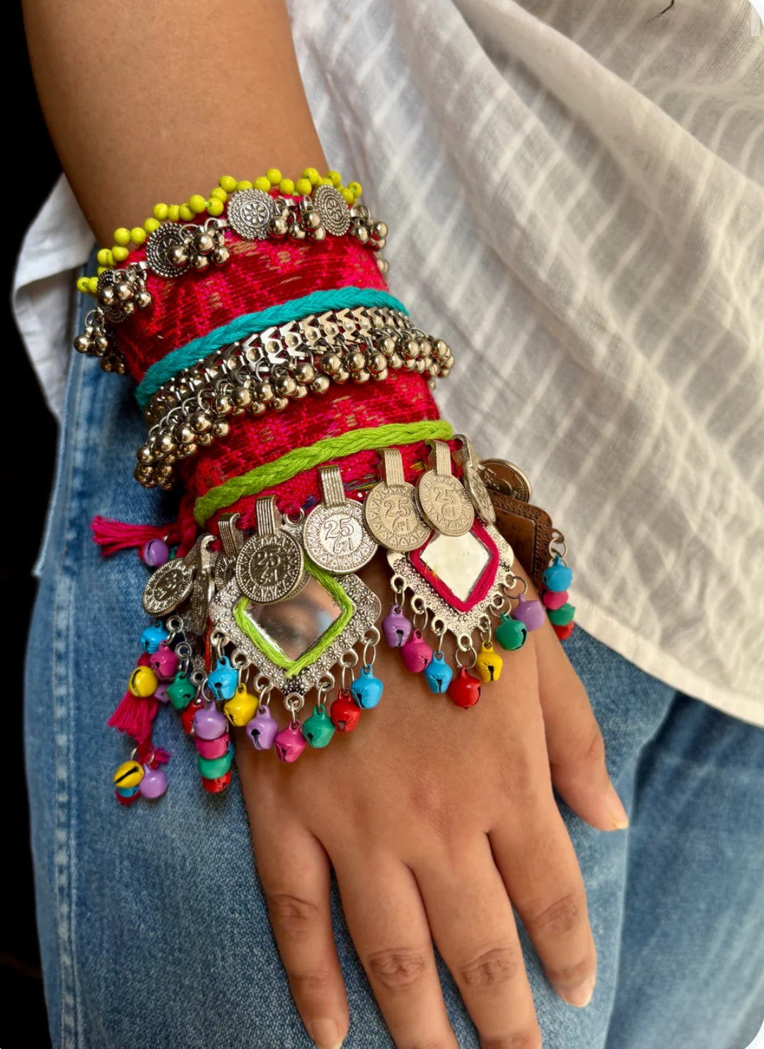 Make a bold statement with our Boho Tribal Mirror Work Handcuffs, beautifully handcrafted to add a touch of ethnic flair to any outfit. These fabric-based cuffs feature intricate mirror work, traditional metallic charms, vibrant thread embroidery, and cowrie shells – combining folk art with modern bohemian vibes.