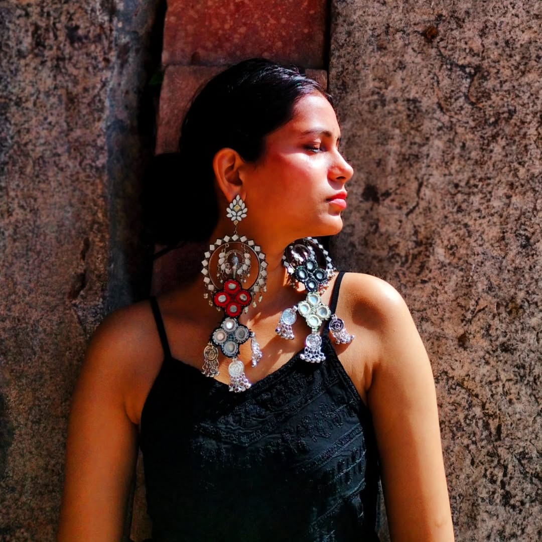 Step into the spotlight with our Divine Darpan Chandbalis — an audacious fusion of heritage and haute couture. These oversized statement earrings feature intricate deity motifs encased in ornate mirror work, surrounded by vibrant enamel accents and traditional jhumki hangings. Crafted for the fearless and the fashionable, they echo tales of devotion, power, and artistic grandeur. Perfect for festivals, editorials, or when you simply want to make an unforgettable entrance.