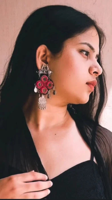 Introducing our exquisite Trishul Earrings, a unique blend of tradition and contemporary design. These stunning earrings feature intricately crafted trishul motifs, symbolizing divine protection and spiritual power. Each earring is adorned with delicate mirrors that catch the light beautifully, adding a touch of sparkle to your ensemble. Additionally, the earrings boast dangling coins that create a charming, jingling effect with every movement, evoking a sense of rich cultural heritage. Perfect for both festive occasions and everyday wear, these earrings are a statement piece that exudes elegance and grace. Embrace your inner goddess with our Trishul with Mirror and Coins Earrings, a perfect addition to your jewelry collection.