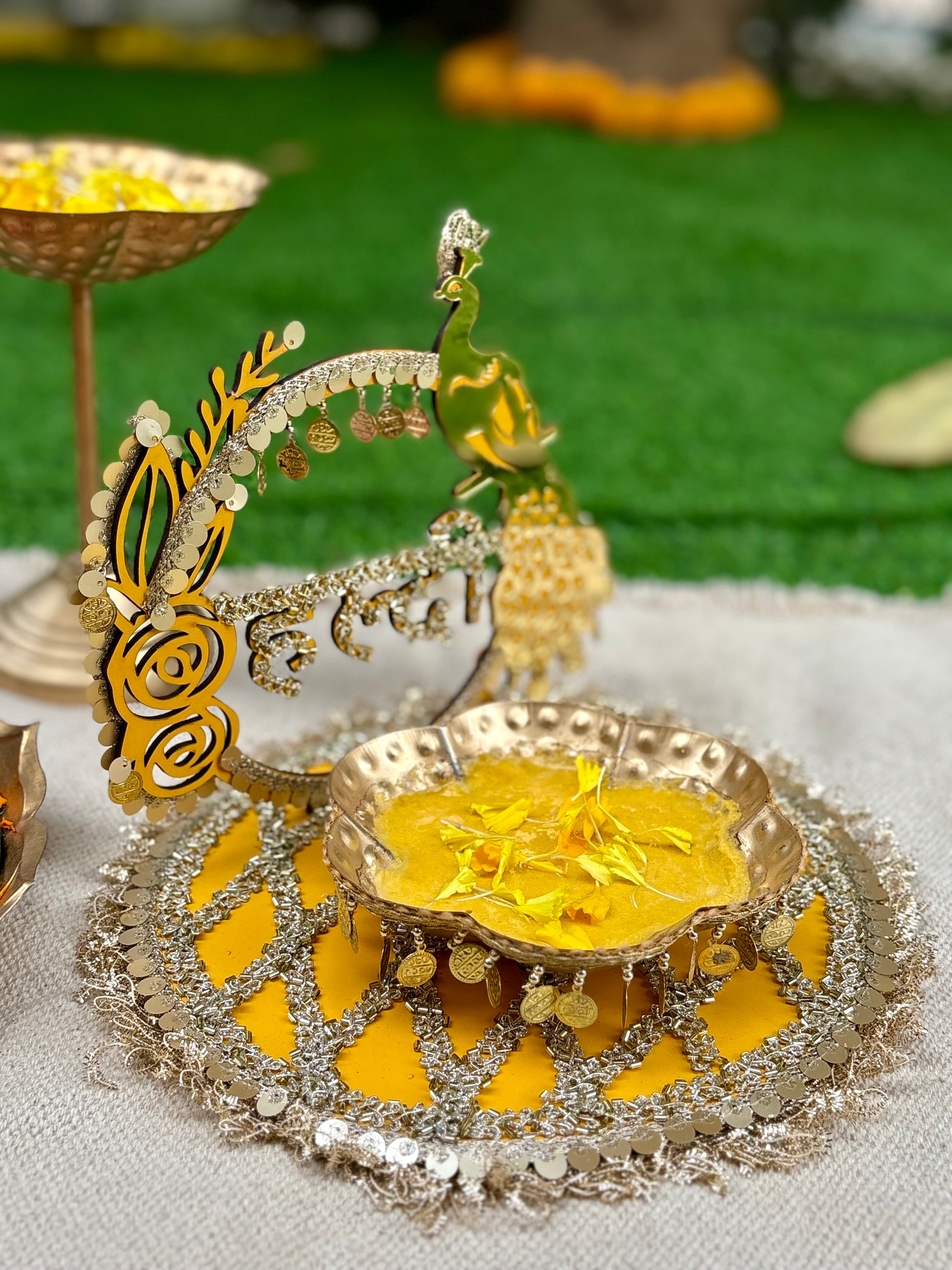 Celebrate the start of your wedding festivities with our Handcrafted Haldi Ceremony Platter, beautifully designed to add a vibrant, festive touch to your special day. Each platter is adorned with intricate detailing, reflecting the colors of joy, purity, and love that the haldi ceremony represents.
