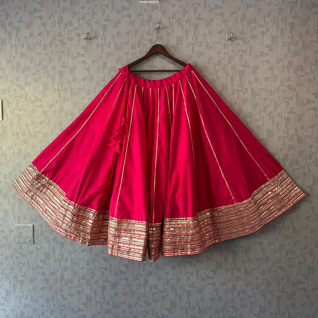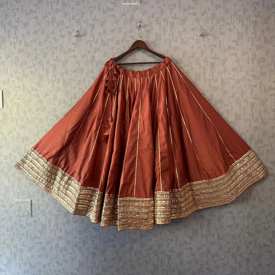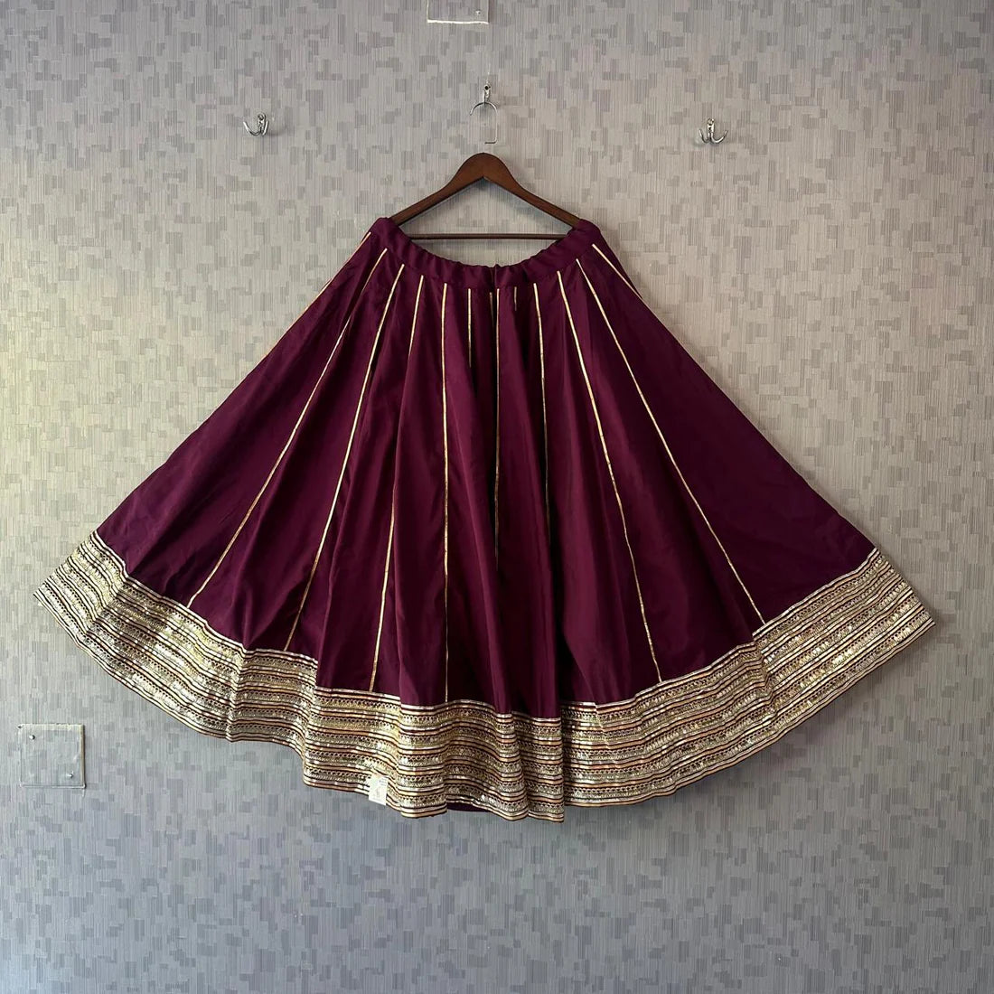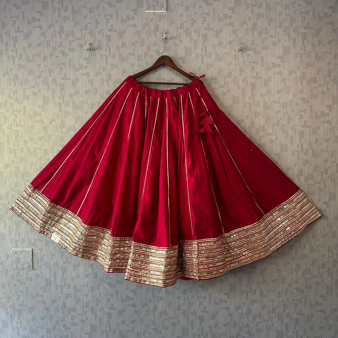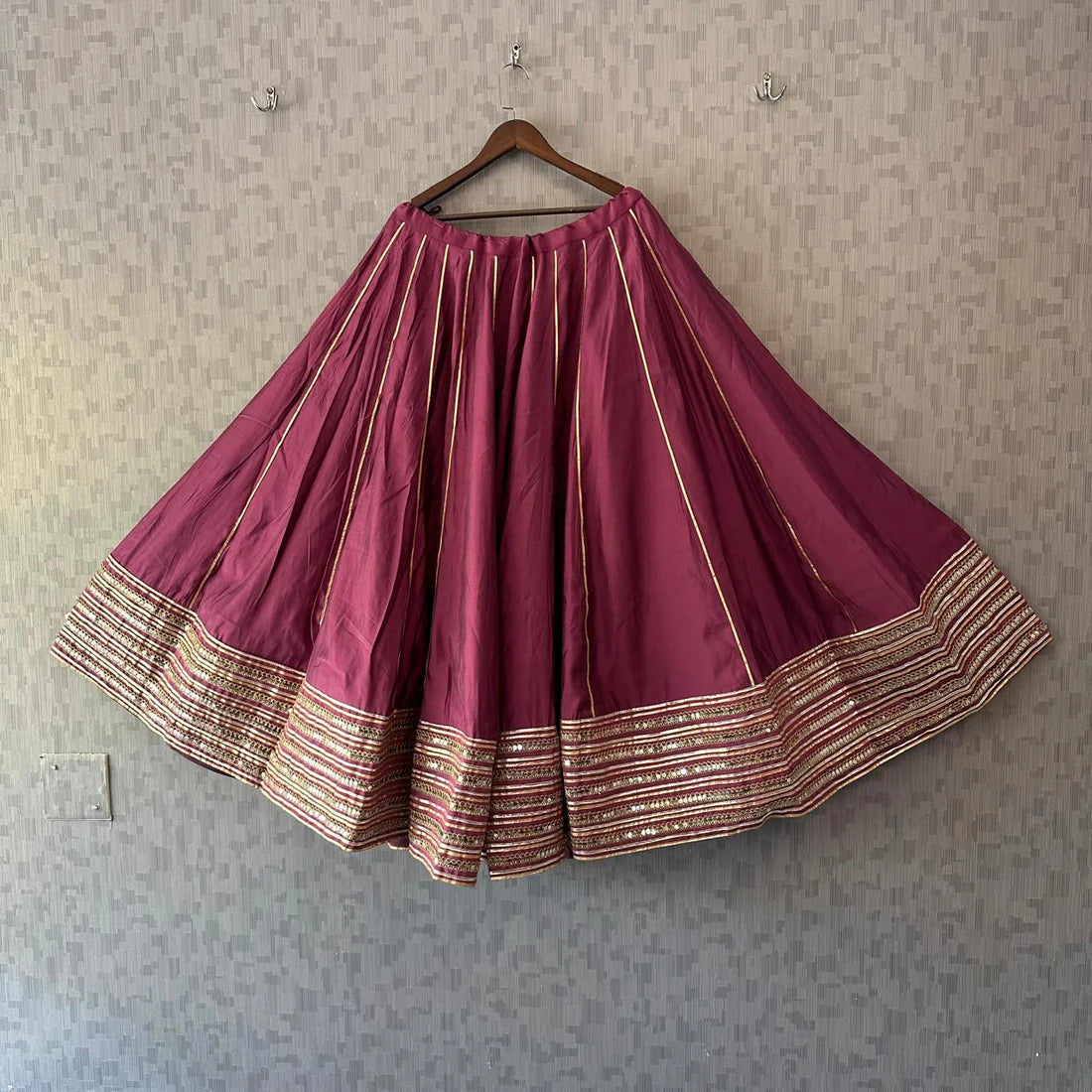Presenting Gulab Raag, a stunning deep maroon foil-work chaniya that captures the elegance of age-old Indian festivities with a rich, modern touch. The bold hue, adorned with delicate foil mirror accents and finished with a grand gold-silver gota border, makes this piece a showstopper in every celebration.