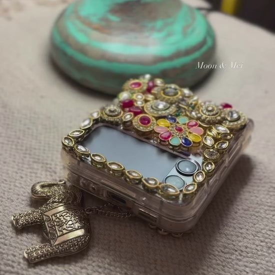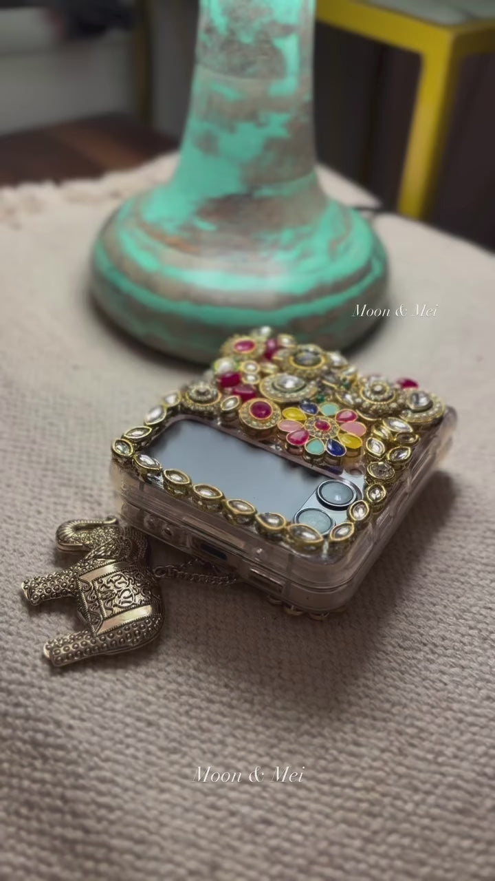 Kundan phone case, luxury Kundan mobile cover, designer phone case India, handcrafted Kundan accessories, royal elephant charm case, Rajasthani royal phone cover, handmade Kundan case, luxury mobile accessories, artisanal phone case, premium Indian phone case.