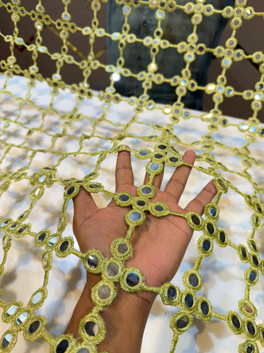 Step into a world of regal romance with our hand-embroidered Mirror Poshida Veil, a masterpiece of artisanal craftsmanship. Each intricate lattice is adorned with shimmering hand-cut mirrors, catching the light from every angle to create a celestial glow. Perfect for brides who dare to be unforgettable, this veil drapes like poetry, blending traditional charm with modern bridal couture.