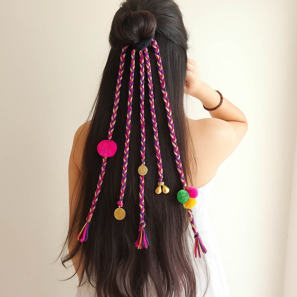 Add a touch of vibrant tradition to your style with our Handcrafted Tribal Hair Band. Featuring colorful braided strands in bold pink, blue, and black, each band is adorned with intricate silver accents and symbolic charms. The highlight is the striking parrot charm, a symbol of beauty and freedom, paired with traditional white cowrie shells that echo the essence of Indian heritage. Perfect for festivals, boho-inspired outfits, or a unique everyday statement. Handmade with care, this accessory blends culture and style seamlessly.