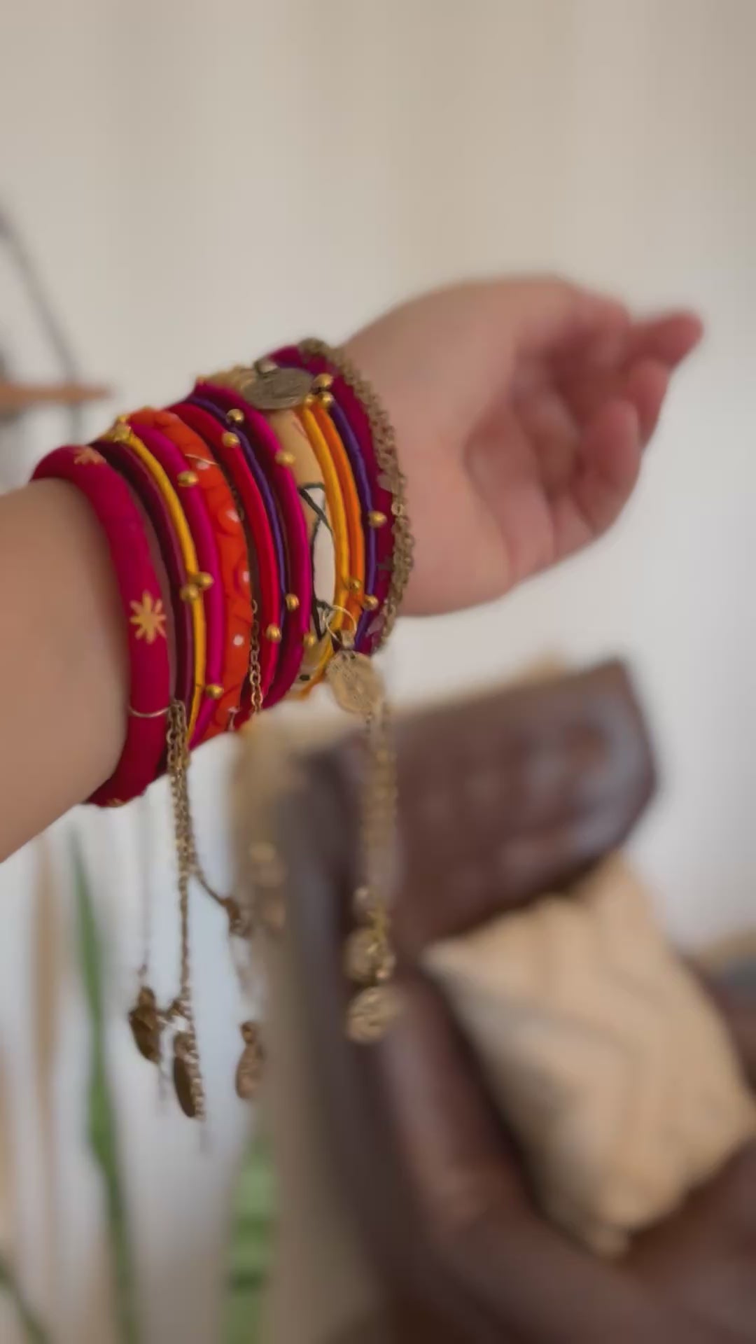 Elevate your ethnic look with our Embellished Bangles Set a stunning blend of tradition and elegance. Handcrafted on rich black velvet, this set features intricate silver detailing including mirror accents, braided metallic threads, and ghungroo embellishments that create a rhythmic charm with every move. Perfect for weddings, festivals, and cultural events, these bangles add a bold, regal touch to any ensemble. Pair them with traditional or fusion wear for an effortlessly chic statement.
