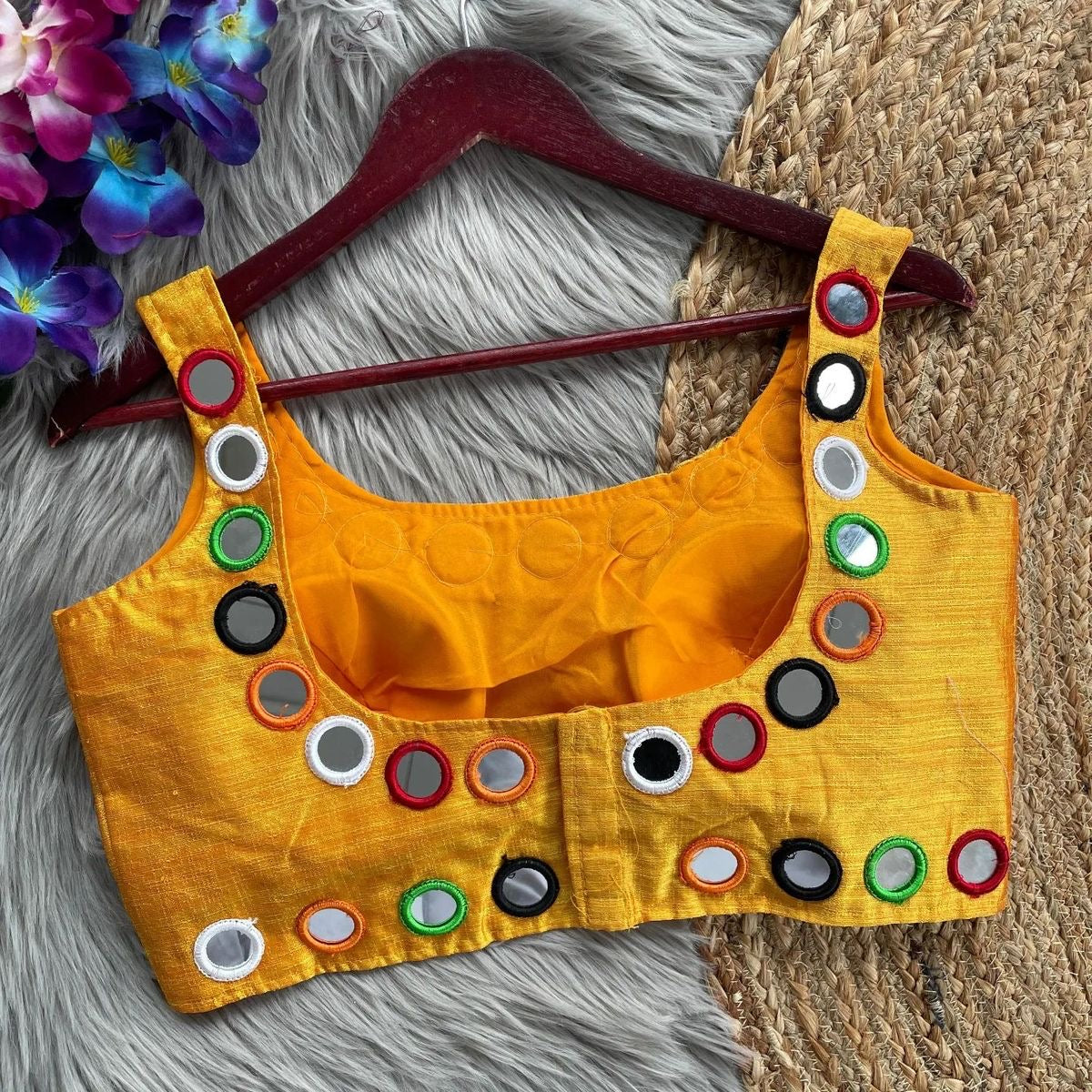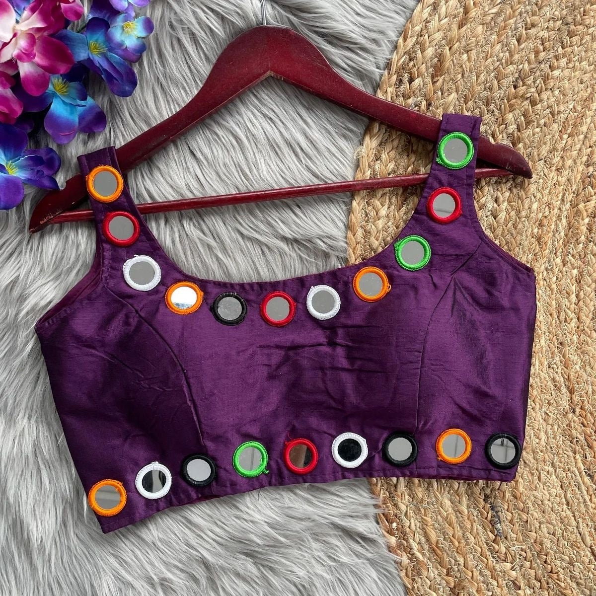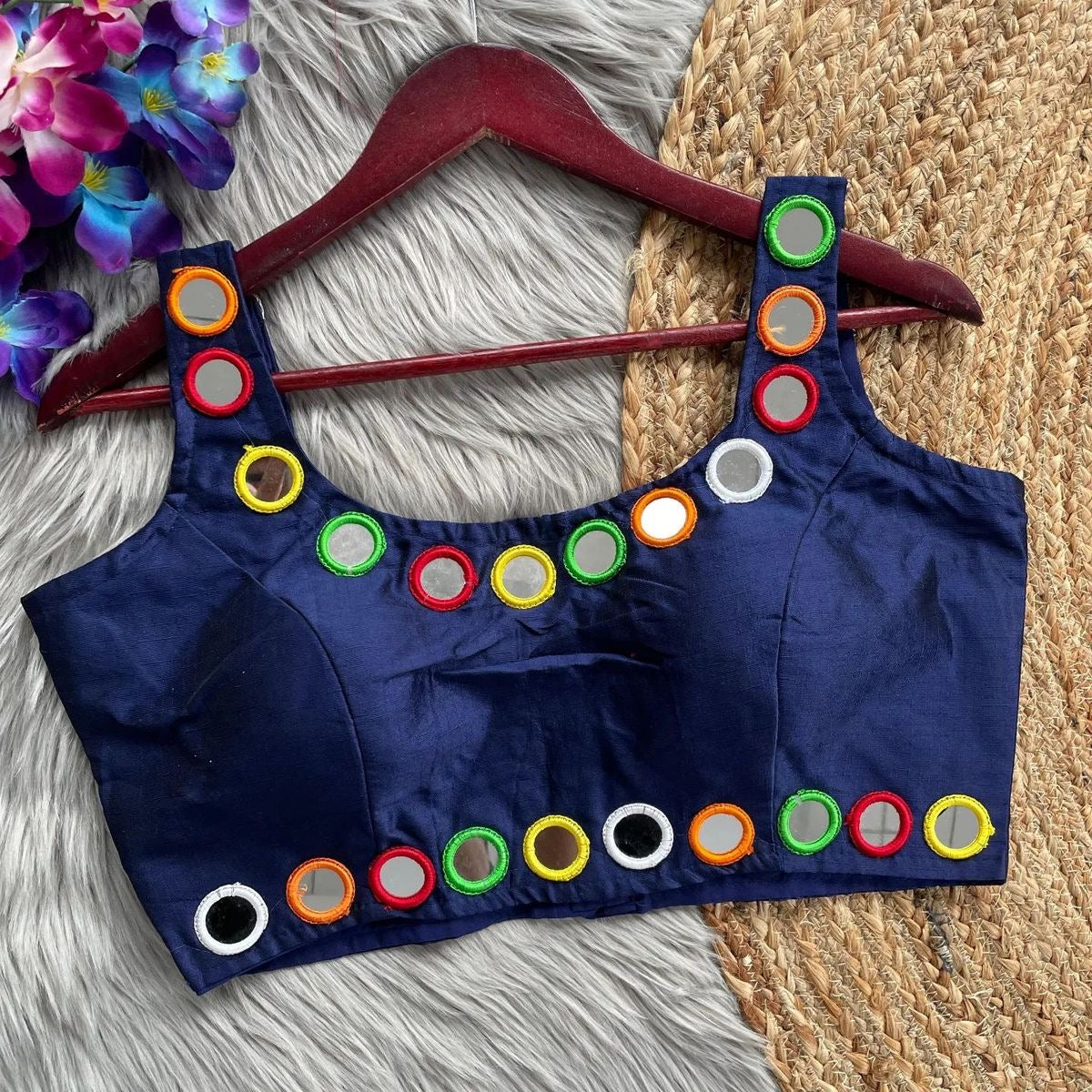 This midnight-hued blouse is a celebration of celestial charm, adorned with delicate mirror work and subtle shimmer that catches every glimmer of light. With its deep-cut back and intricate thread detailing, Noor-e-Raat evokes the elegance of festive nights and the radiance of a woman dancing under the stars. Pair it with a flowing lehenga or earthy boho skirt and let your aura light up the garba ground.
