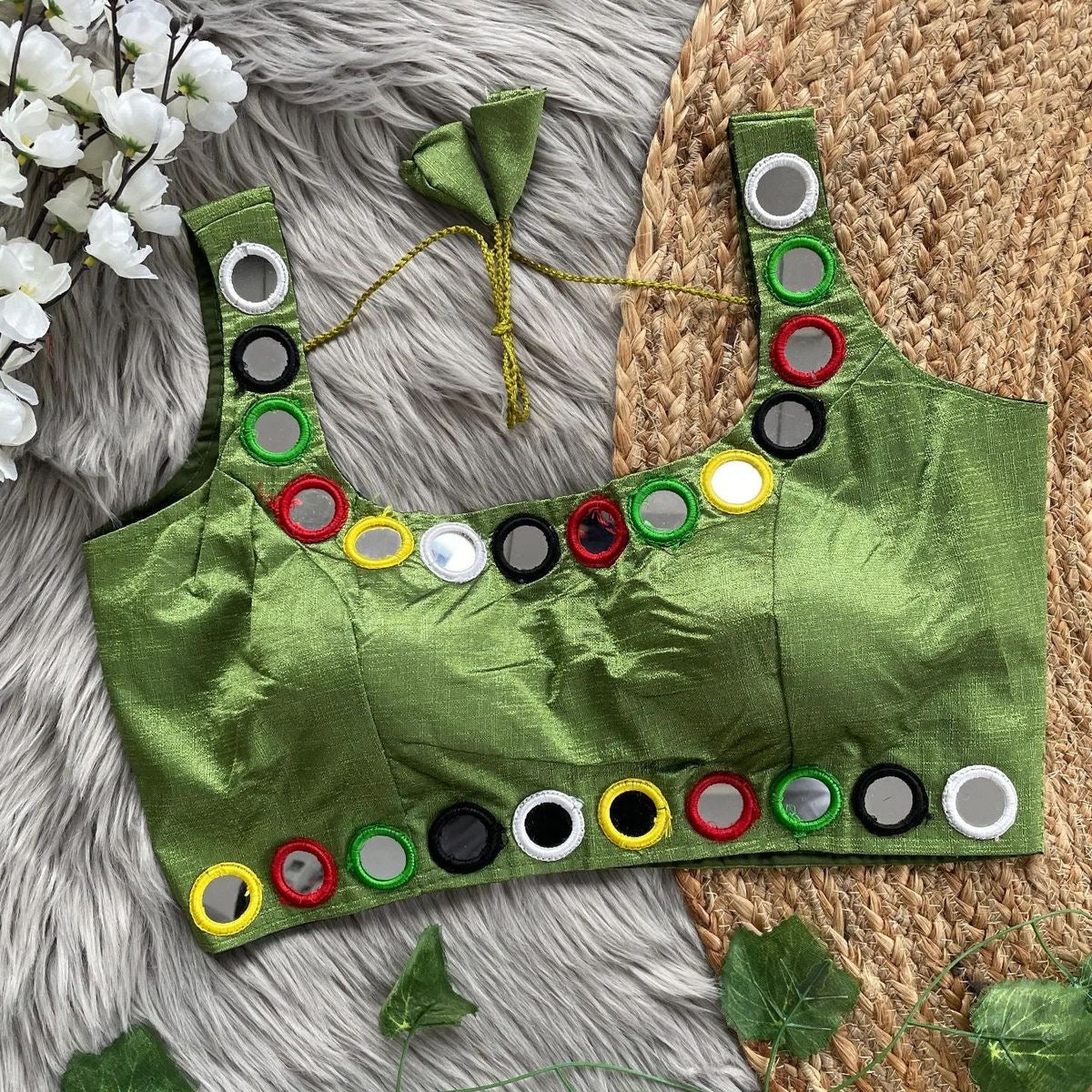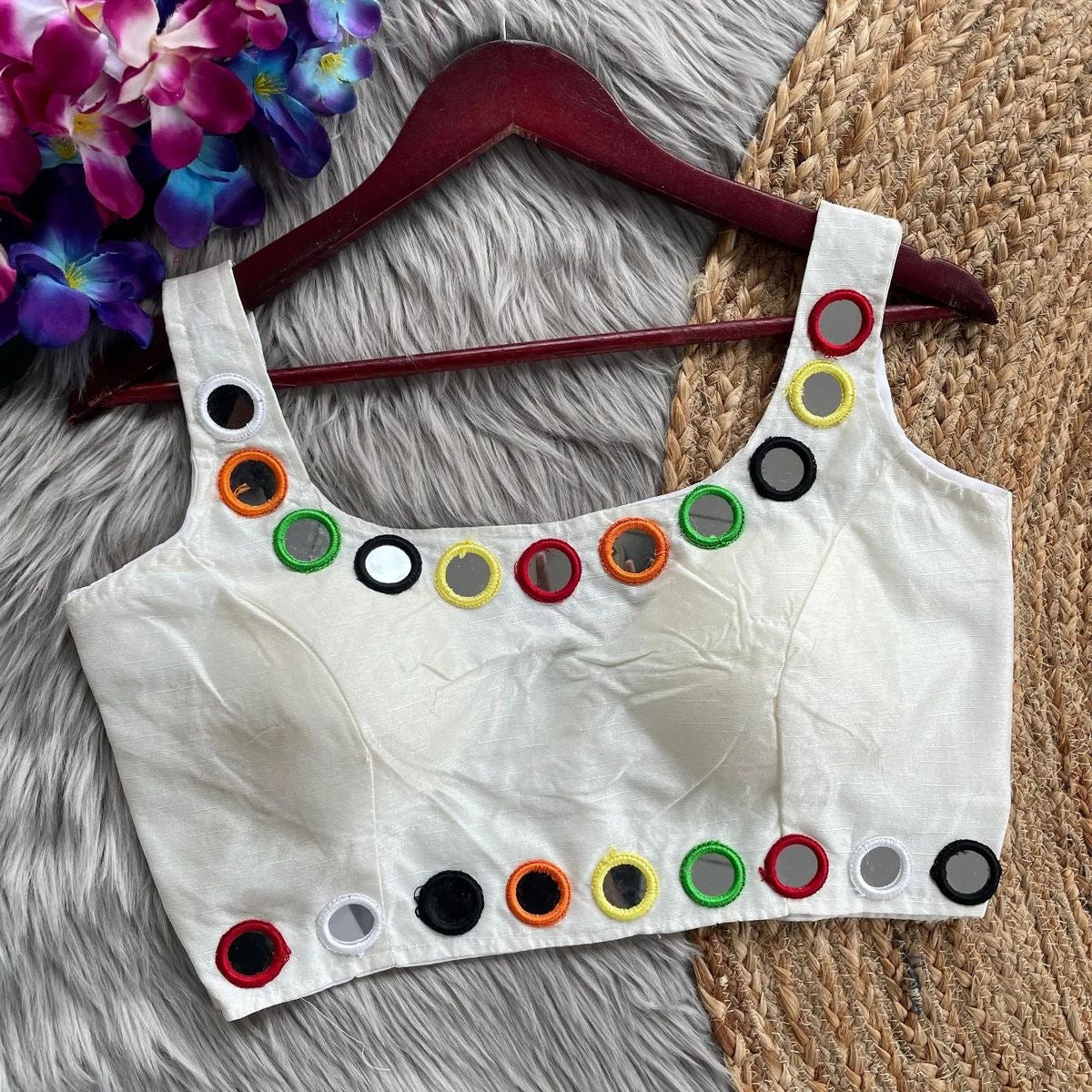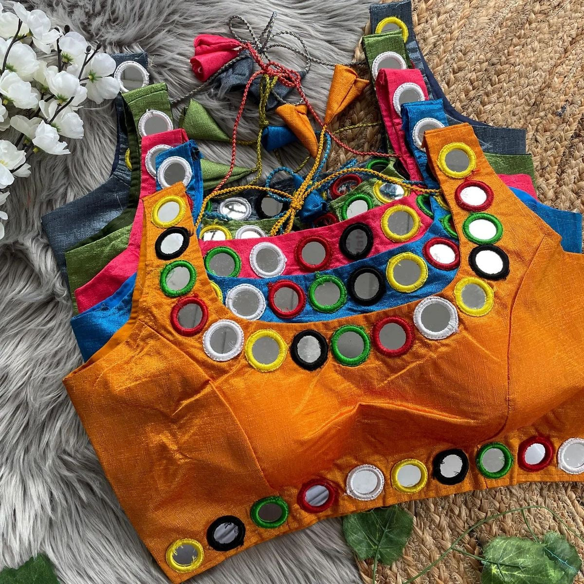 This midnight-hued blouse is a celebration of celestial charm, adorned with delicate mirror work and subtle shimmer that catches every glimmer of light. With its deep-cut back and intricate thread detailing, Noor-e-Raat evokes the elegance of festive nights and the radiance of a woman dancing under the stars. Pair it with a flowing lehenga or earthy boho skirt and let your aura light up the garba ground.