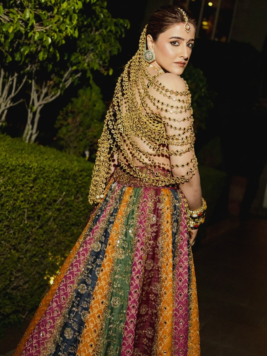 Elevate your bridal hairstyle with this stunning braid chain inspired by Nupur Sanon’s iconic Mehendi & Dhol Night look. Crafted in an antique gold finish, this luxurious choti jewellery features cascading layers of delicate coin and mirror chains that beautifully adorn the length of the braid, creating a rich, regal flow with every movement.