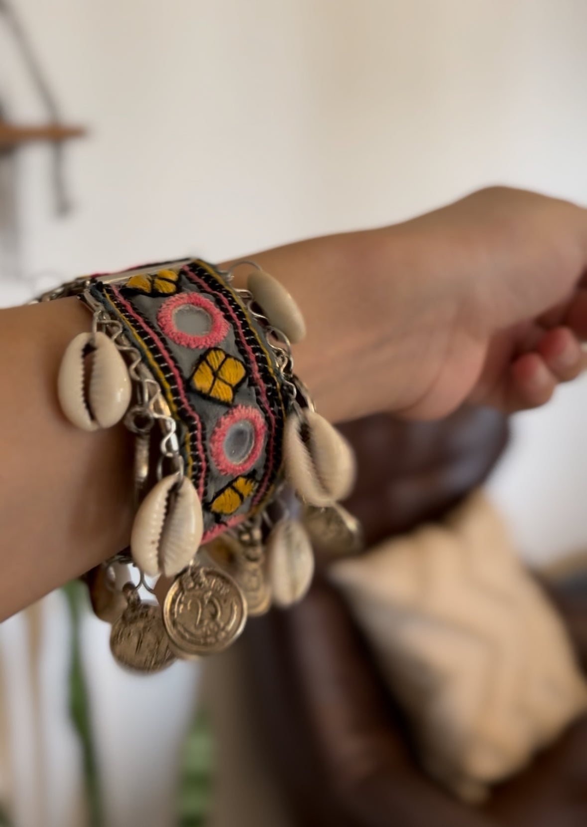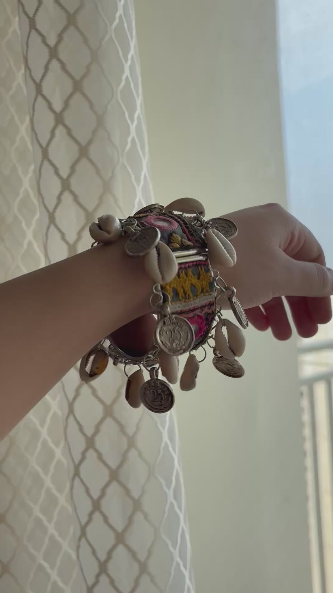Add a splash of vibrant heritage to your look with the Mirror Cuff — a handcrafted bohemian bangle adorned with colorful threads, intricate Kutchi embroidery, mini ghungroos, and mirror detailing. This bold and playful accessory reflects the rich craftsmanship of Gujarat and makes a statement whether paired with ethnic wear or styled with modern silhouettes. Lightweight, adjustable, and full of festive charm, it’s the perfect companion for Navratri nights, music festivals, or any day that needs a pop of color.