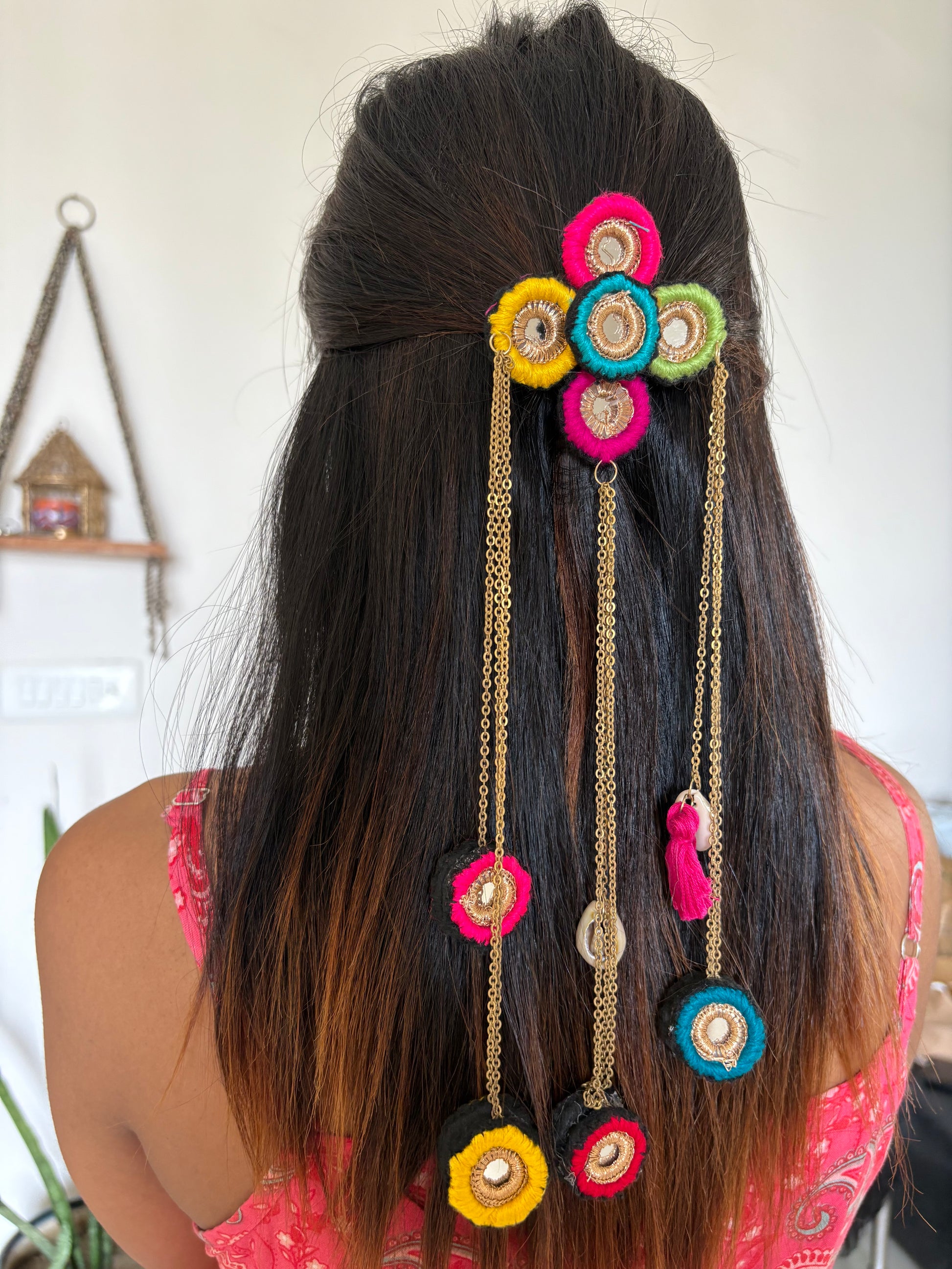 Rooted in tradition, made for the modern muse – this handcrafted hair clip celebrates the timeless beauty of Kutchh embroidery from Gujarat. Intricately stitched with multicoloured thread on a rich textile base, and adorned with cascading brass chains and vintage coin charms, this statement piece brings folk-art magic to your tresses.