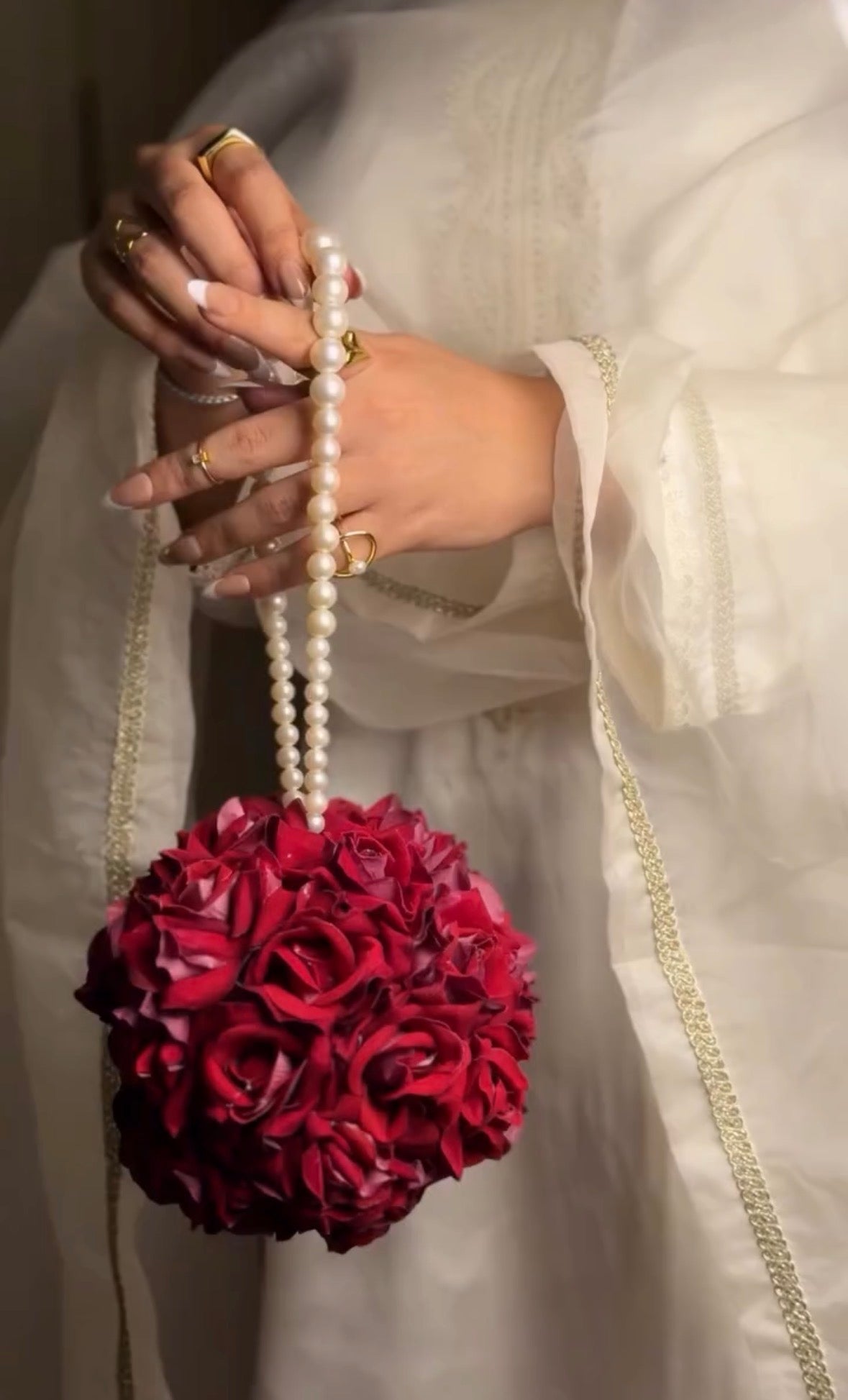 Elevate your festive and wedding look with this luxurious handmade rose potli bag, beautifully crafted with rich red faux roses arranged in a full, blooming sphere. Designed with an elegant double-strand pearl handle, this statement accessory adds the perfect blend of charm and sophistication to your ethnic and contemporary outfits.