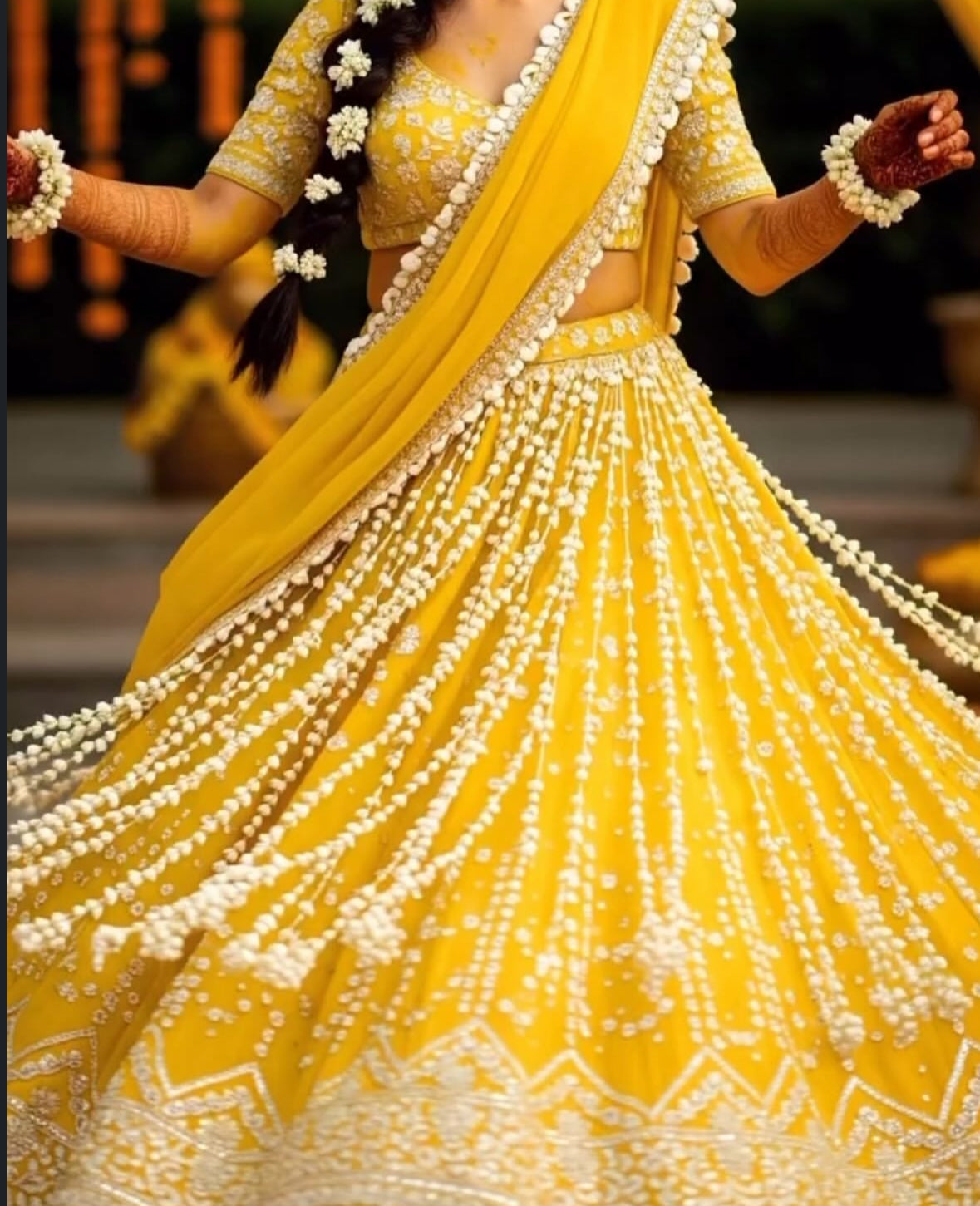 Radiating pure sunshine vibes, this Haldi 2025 wedding trend is all about embracing tradition with a whimsical twist. Draped in a marigold yellow lehenga, the look is elevated by the phool wrap-around accessories — delicate strands of fresh florals cascading effortlessly around the braid, wrists, and waist, creating a poetic dance with every step. These dreamy floral strings aren’t just accessories; they’re an emotion — a celebration of love, laughter, and the golden glow of new beginnings. Perfect for the modern bride who wants to look like she stepped straight out of a fairytale, this floral wrap has become the most-wanted haldi essential of the year. 🌼✨ #Haldi2025 #FloralWrapTrend #GoldenBrideMagic
