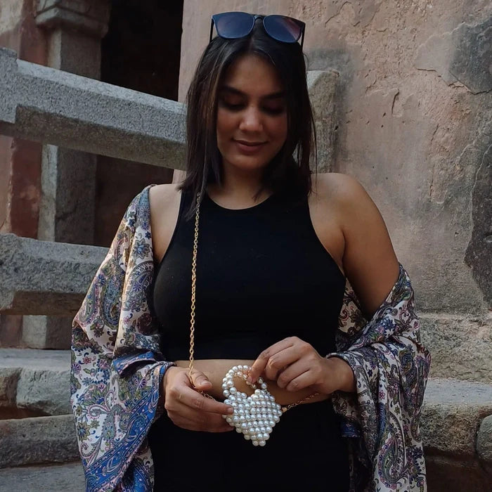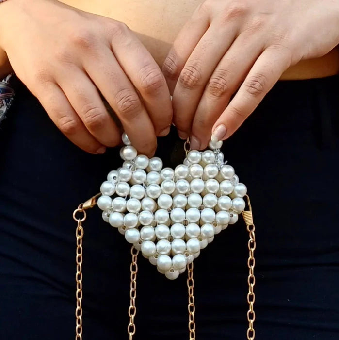 The Pearl Mini Heart Bag is a charming accessory featuring a heart-shaped design, typically crafted from high-quality materials. It's adorned with pearl embellishments, adding a touch of elegance. This compact bag usually comes with a detachable chain or strap for versatile carrying options and is perfect for adding a whimsical flair to any outfit.