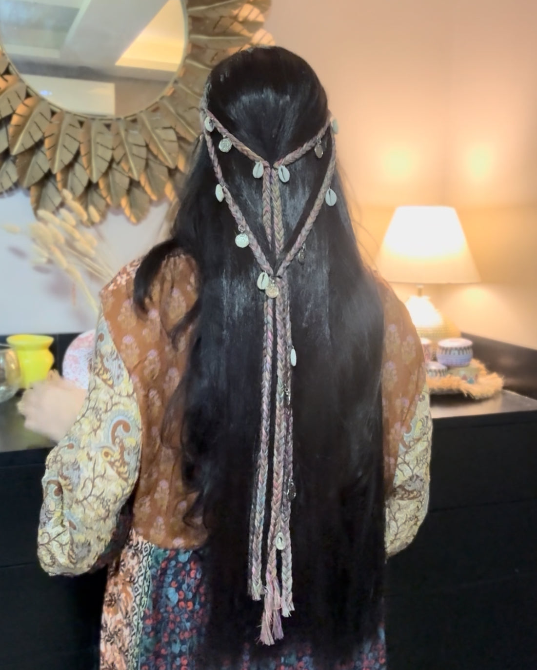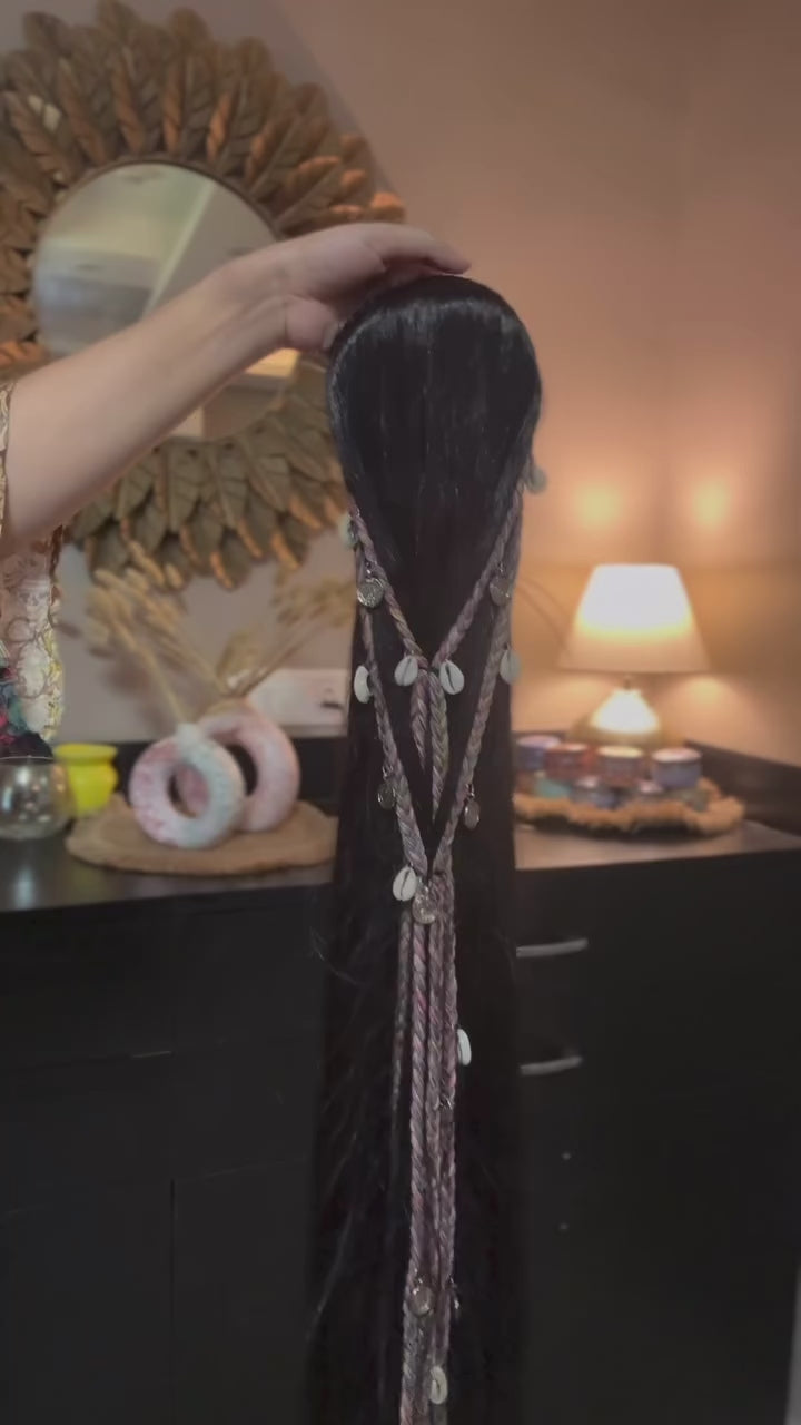 Step into the festive season effortlessly with our Boho Braided Shell Hairpiece—a beautifully handcrafted accessory that gives you a ready-to-go Navratri hairstyle in seconds. No need for a hairstylist—this piece comes with braided hair attachments, shells, mirror charms, and coins, all woven into a lightweight, easy-to-wear design.