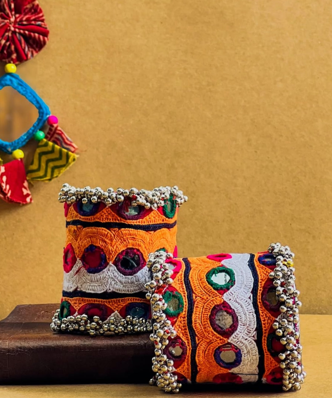 Make a bold statement with our Boho Tribal Mirror Work Handcuffs, beautifully handcrafted to add a touch of ethnic flair to any outfit. These fabric-based cuffs feature intricate mirror work, traditional metallic charms, vibrant thread embroidery, and cowrie shells – combining folk art with modern bohemian vibes.