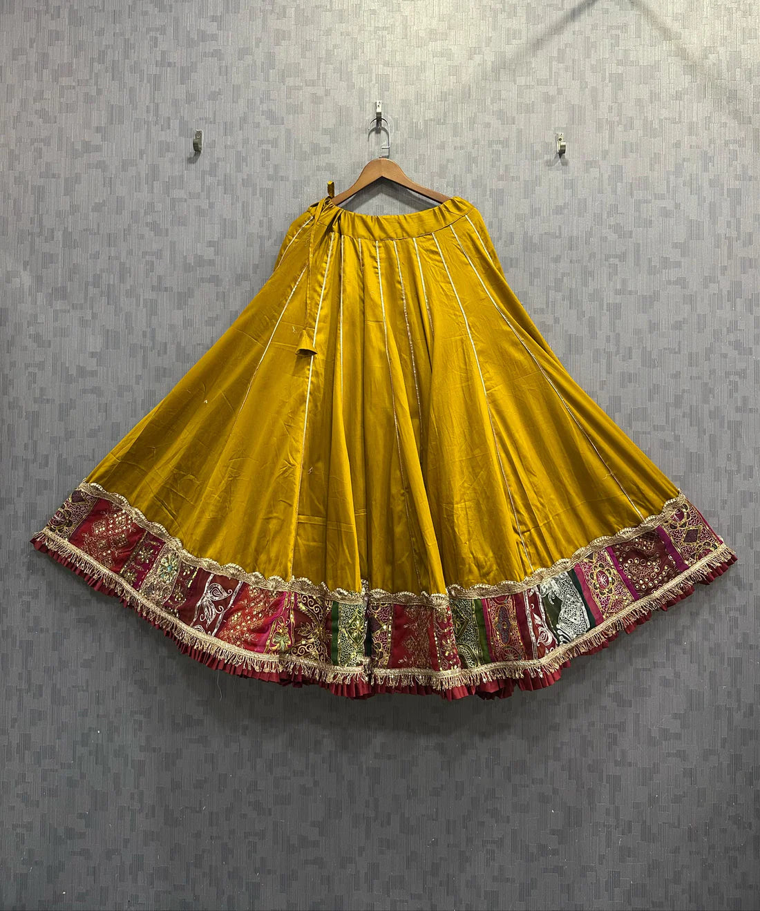 This chaniya is perfect for Navratri nights, sangeet ceremonies, or for bridesmaids looking for understated elegance with a traditional soul. It pairs beautifully with contrast or matching blouses for a complete festive look.