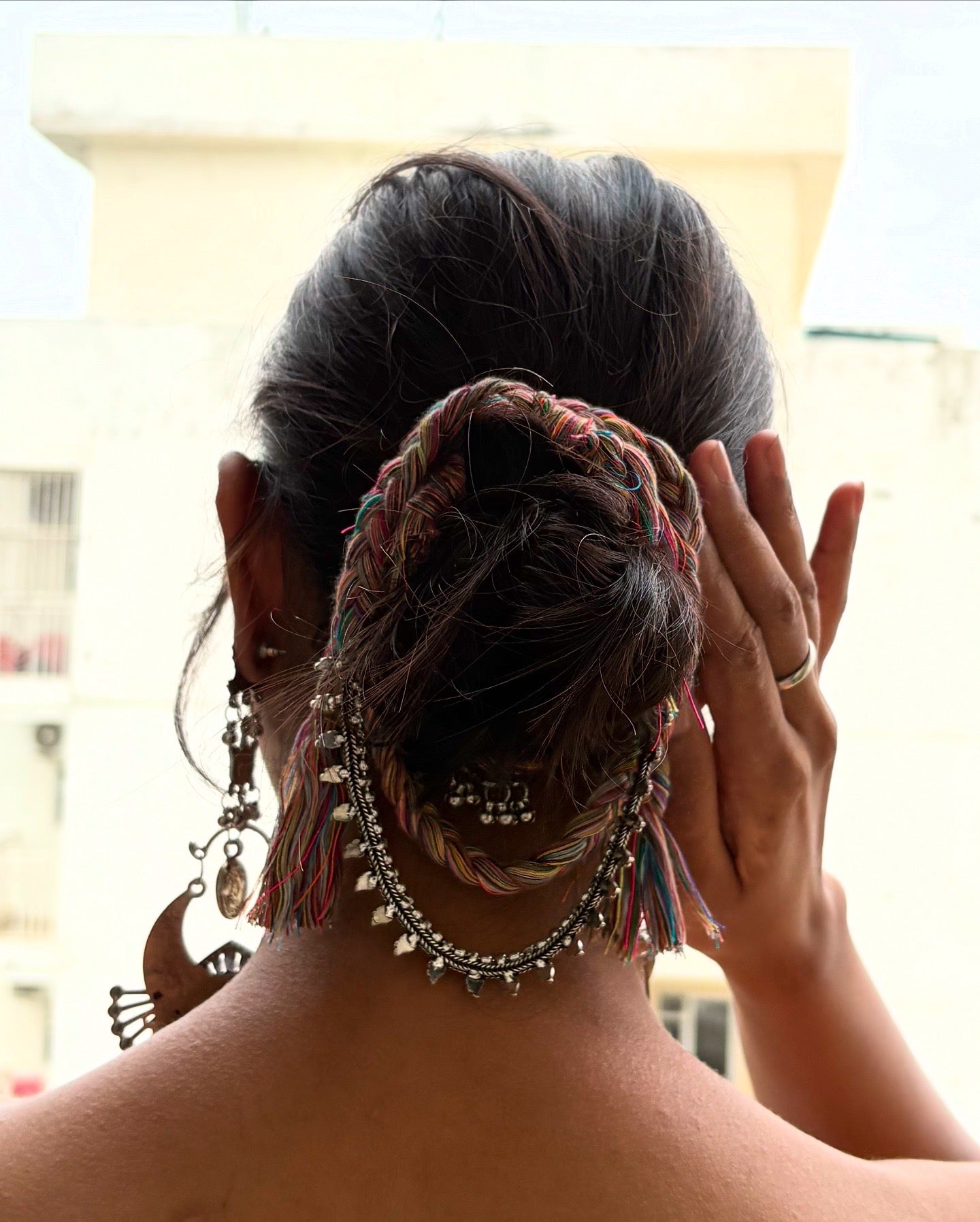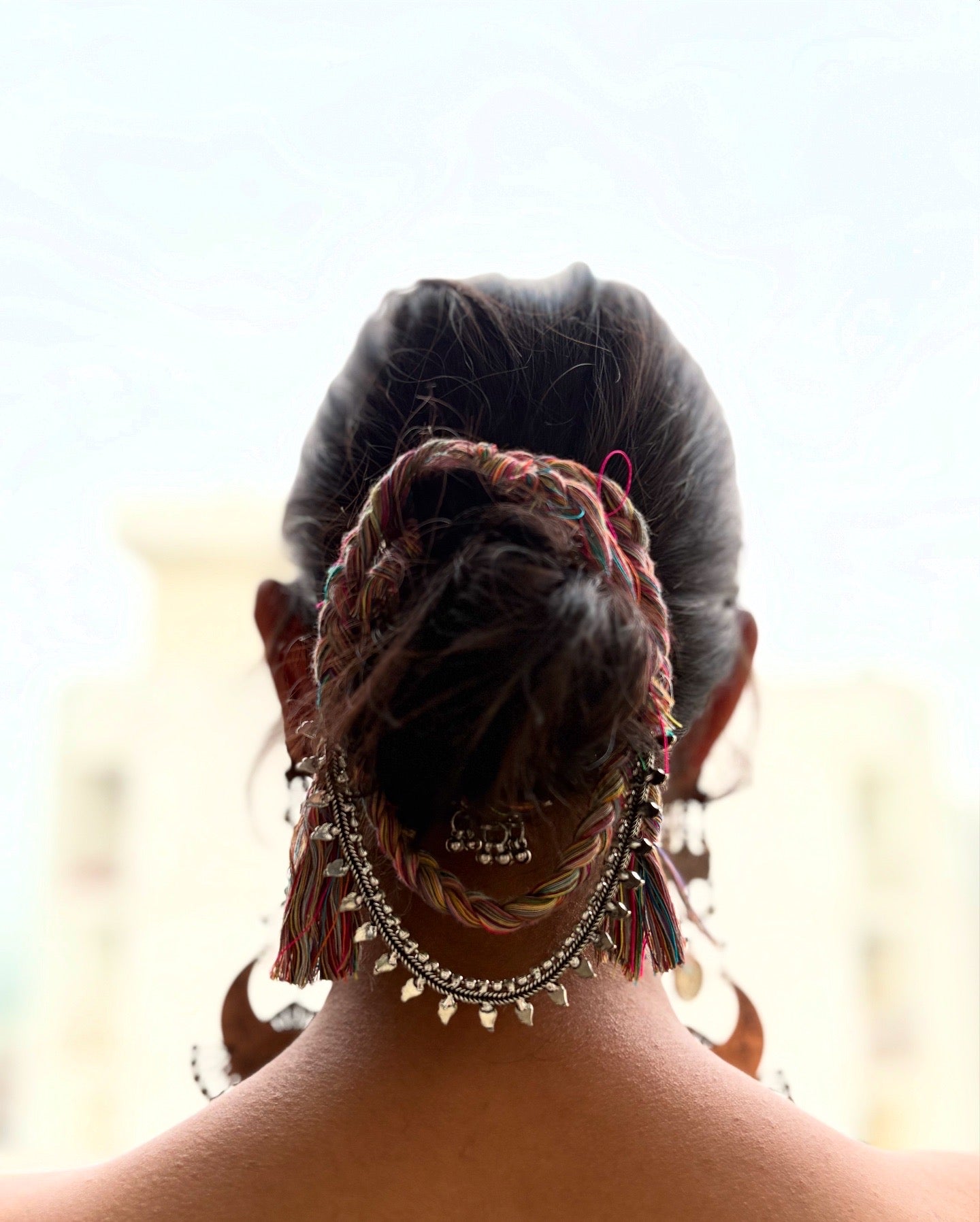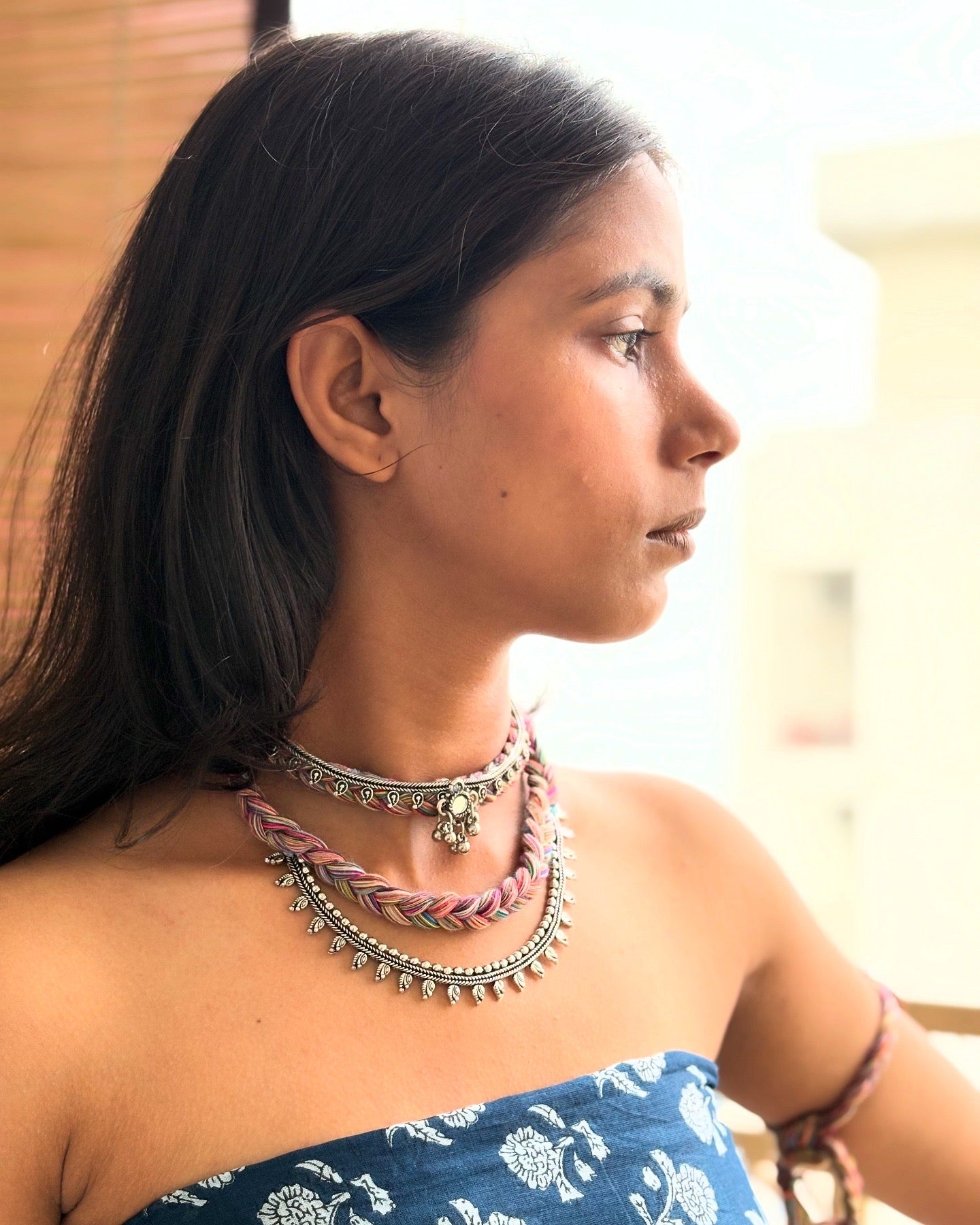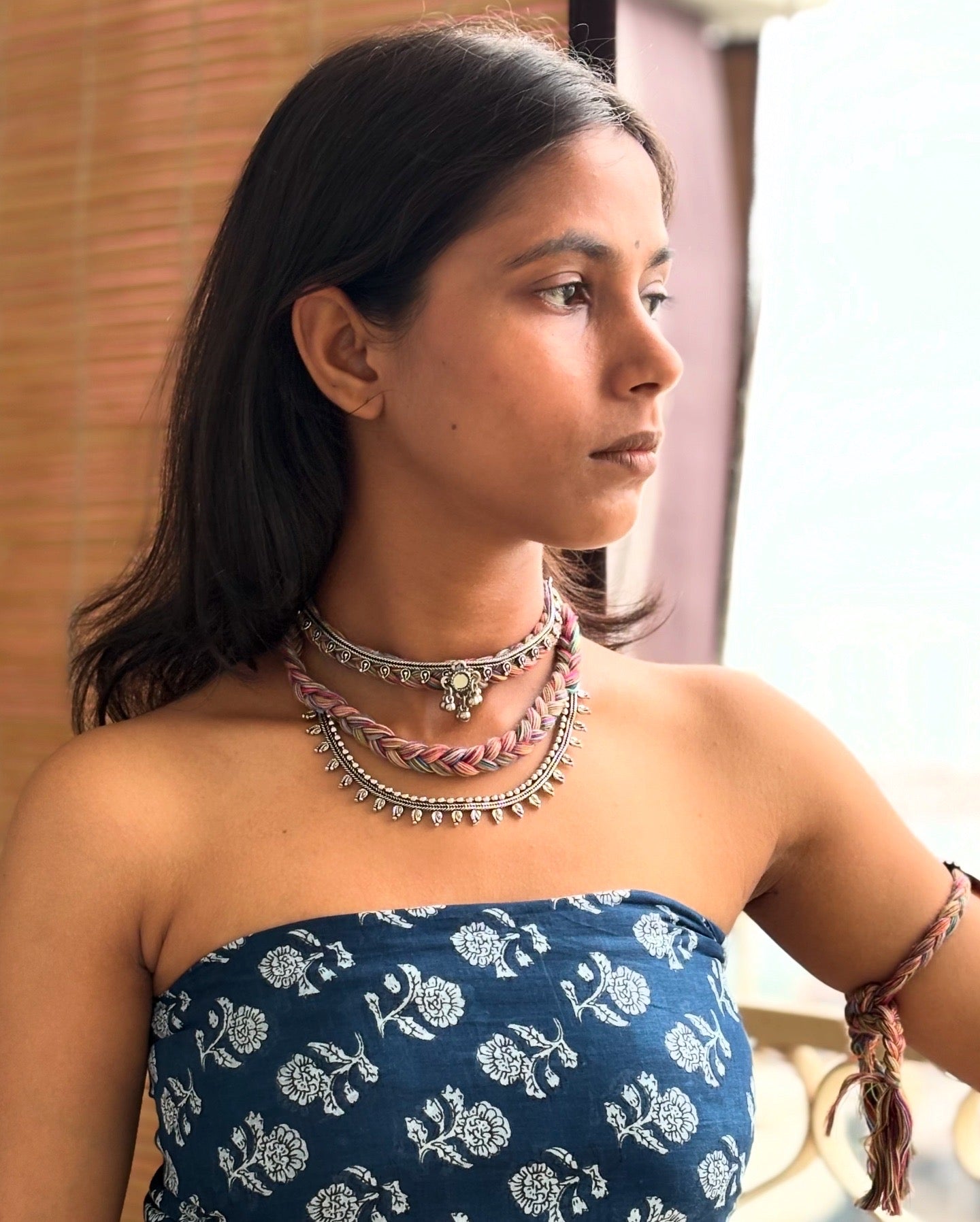 Meet Viraavi, your go-to bohemian statement piece that seamlessly transforms from a neckpiece to a hair accessory. Handcrafted with a blend of oxidized silver charms and soft, twisted threads in earthy hues, this two-in-one design reflects the free-spirited essence of boho style. Whether you wear it as a choker layered with tribal elements or twist it into a braid or bun for a chic hair wrap, Viraavi adds that effortless elegance and versatility to your everyday look. Perfect for festivals, getaways, or adding a boho touch to your basics.